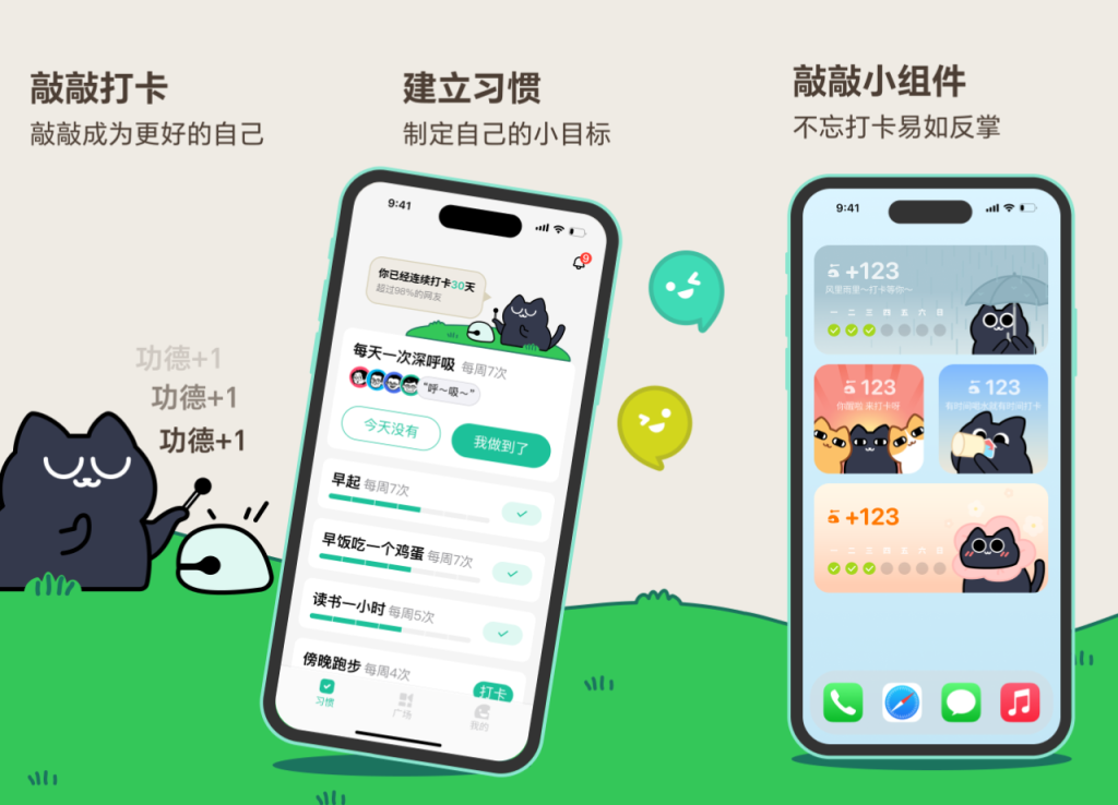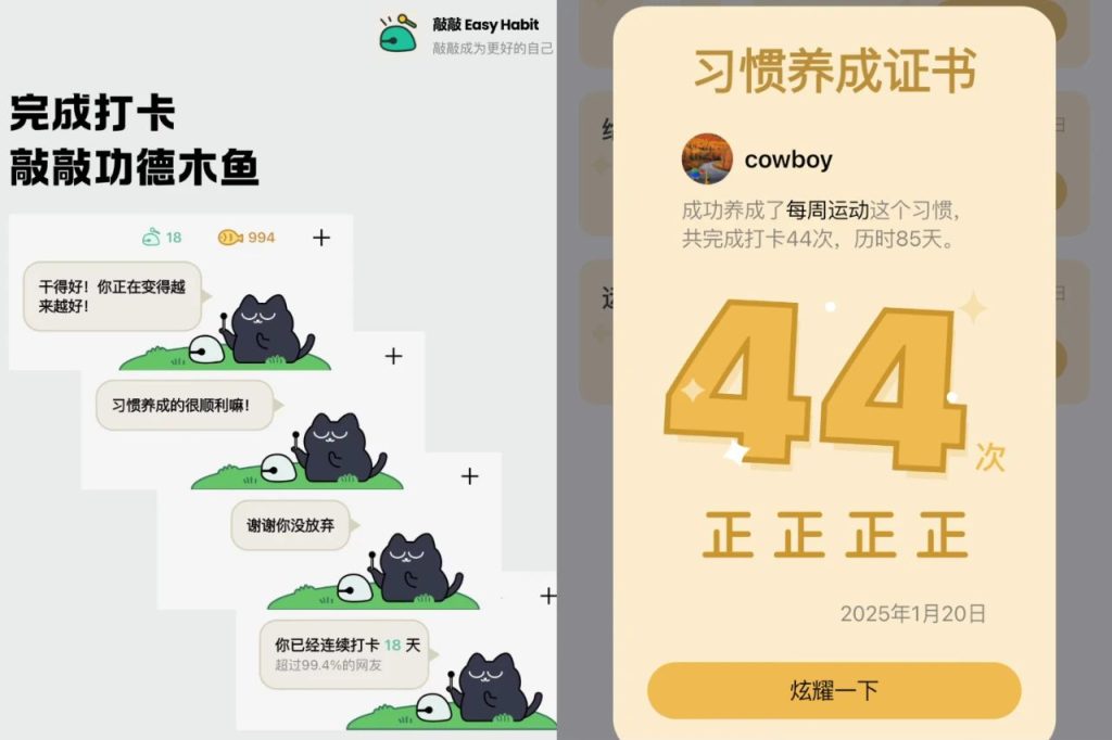 - 完成打卡 → 敲木鱼“咚”一声,功德值+3,猫咪也为你鼓掌